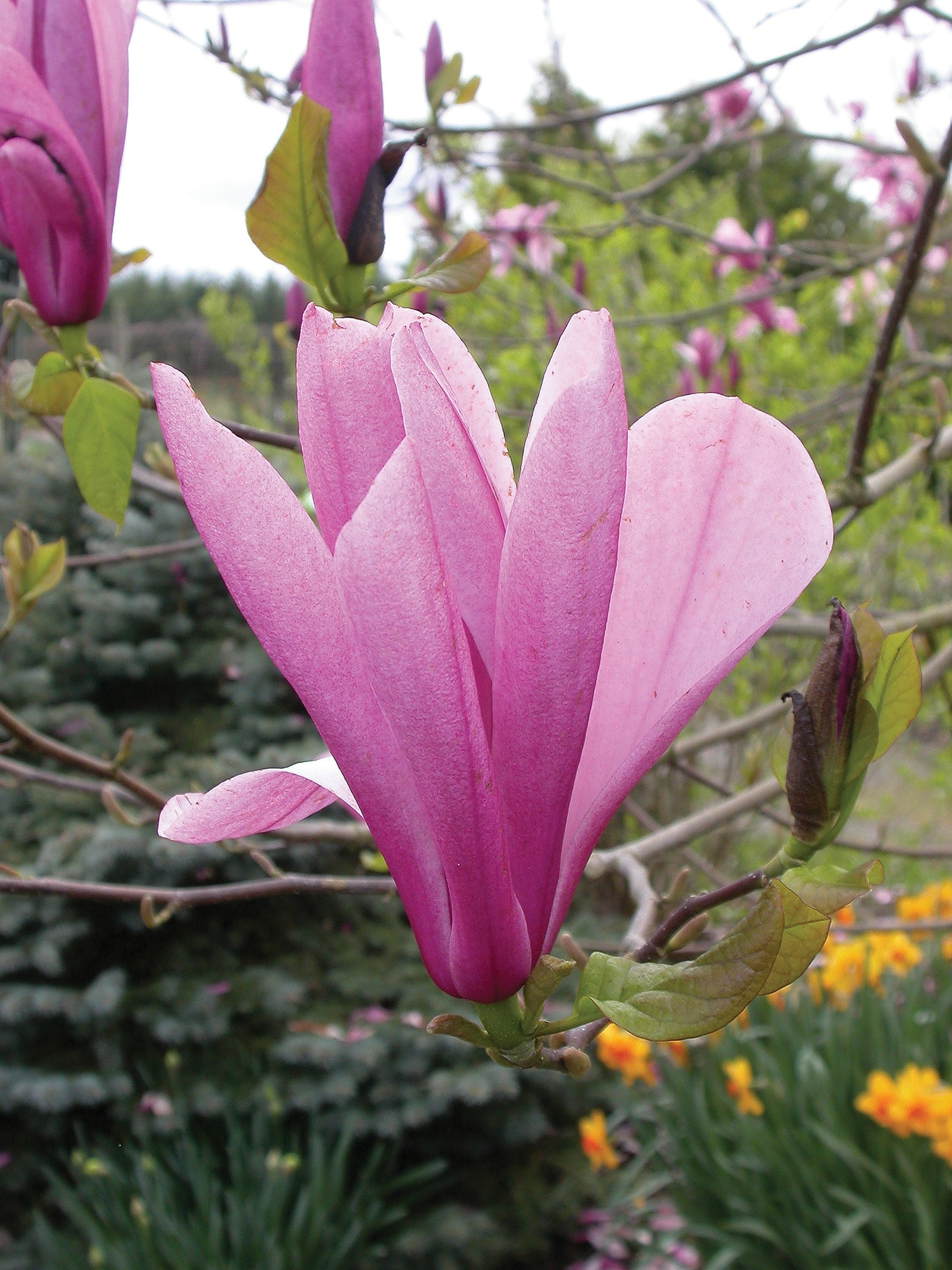 Galaxy Magnolia is a sturdy, relatively narrow tree that has handsome leaves all summer and into the fall. But there’s more! Just before the leaves unfurl in late spring, the tree explodes with tulip-cup flowers in rich lavender-pink shades—and butterflies flock to it.