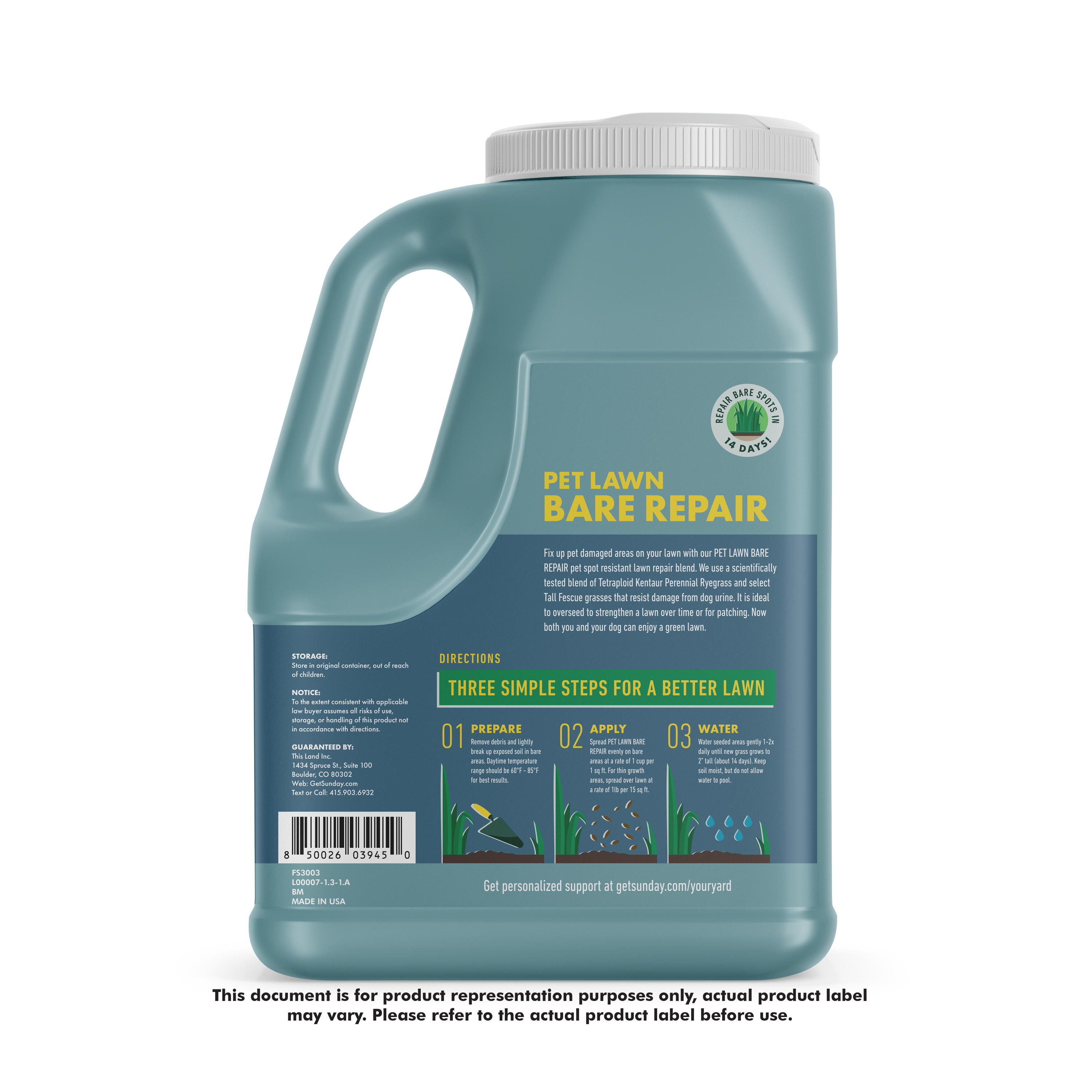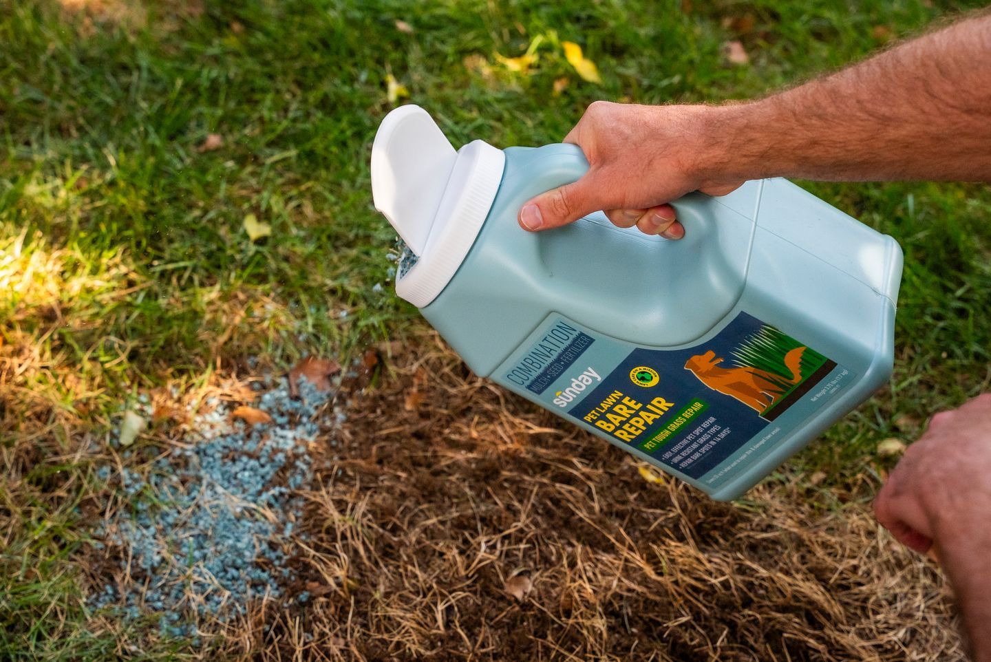Our easy-to-use lawn repair combines urine-resistant seed, slow-release nitrogen, and moisture-holding mulch to repair pet spots, thicken thin spots, stimulate growth, and green your lawn. Pet Lawn Bare Repair grows pet-resistant grass in just two weeks to help you maintain a more durable. pet-friendly lawn that is resistant to future pet spots and thinning areas.