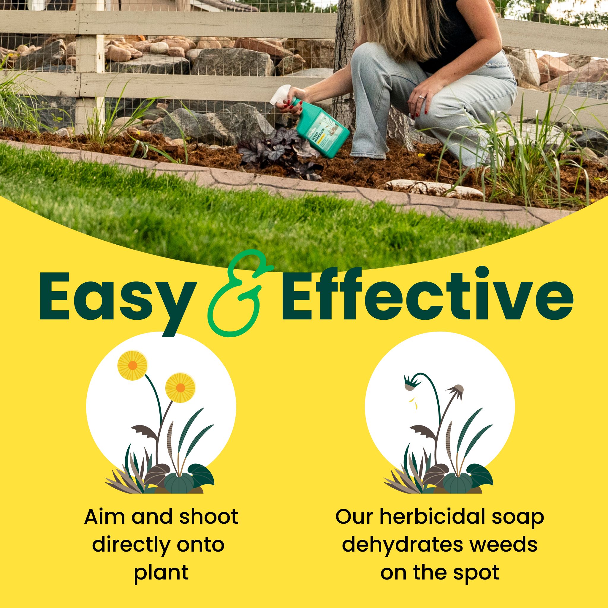 Two 32 oz. spray bottles of organic herbicidal soap weed killer. Covers up to 100 sq. ft. of weeds.
