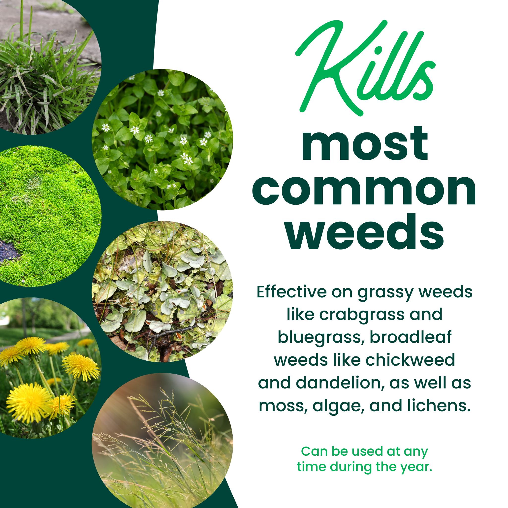 Effective against bluegrass, chickweed, crabgrass, corn spurry, dandelion, groundsel, lambsquarters, mouse-eared chickweed, mustards, plantain, redroot pigweed, round leaved mallow, sheep sorrel, shepherd's-purse, stinkweed, thistle, moss, algae, and lichens.